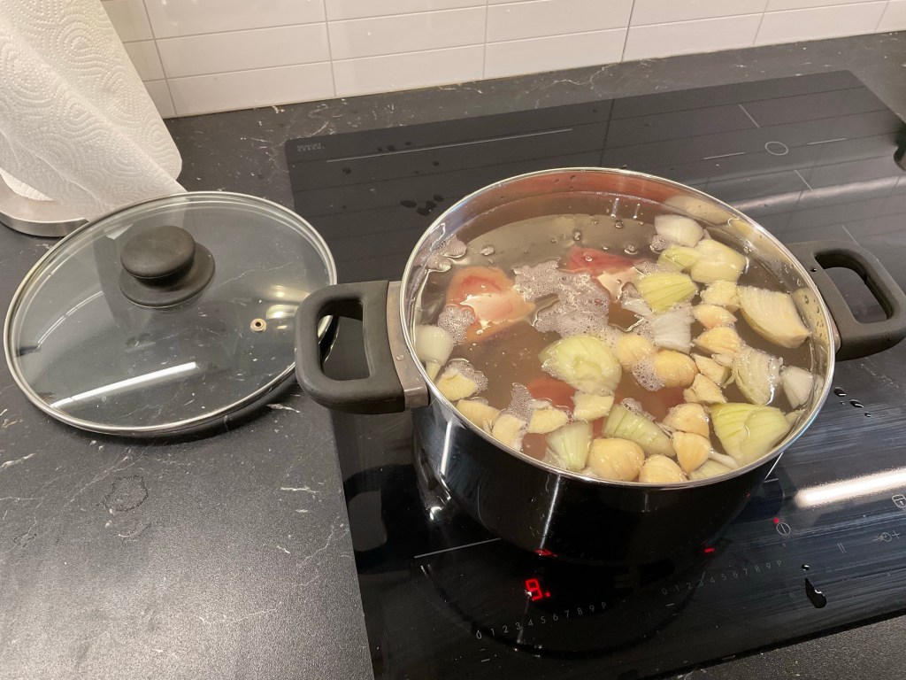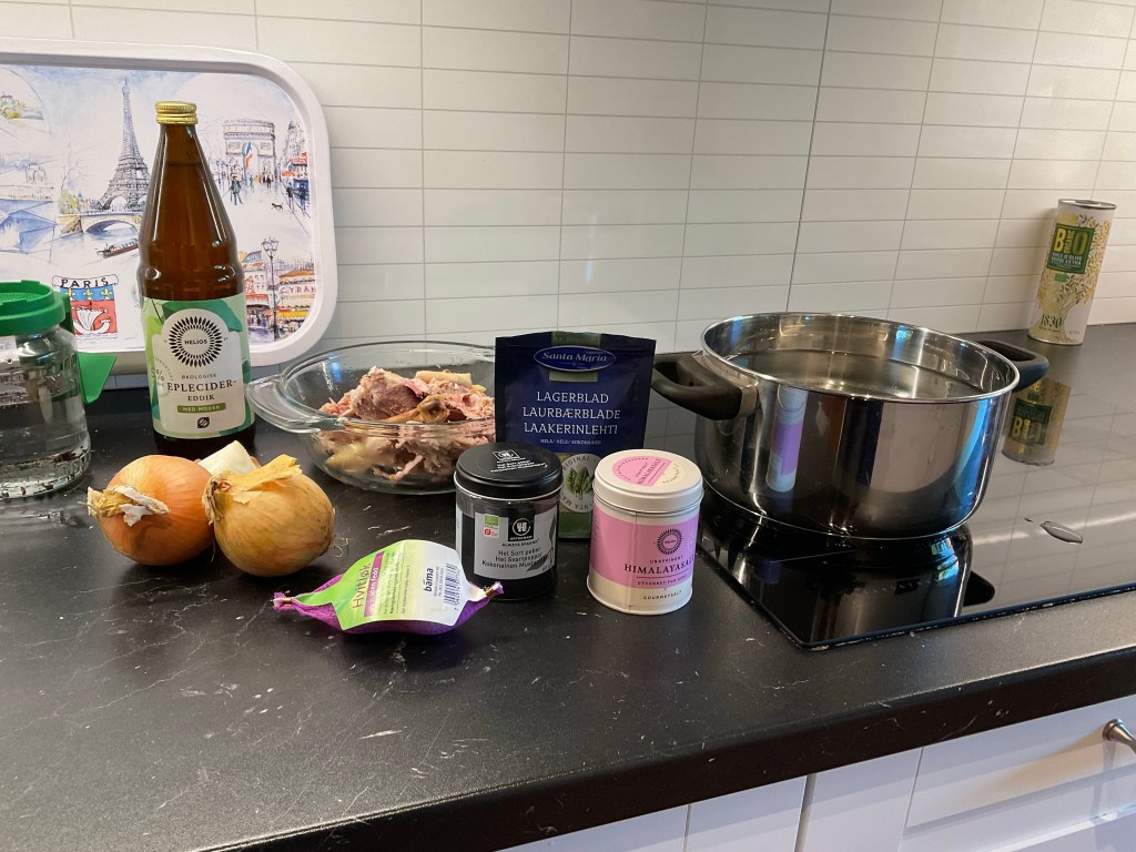 På förslag av Martina Johansson kan man också ha i lite äpplecidervinäger som ska hjälpa till att dra ut näringsämnena från benen.